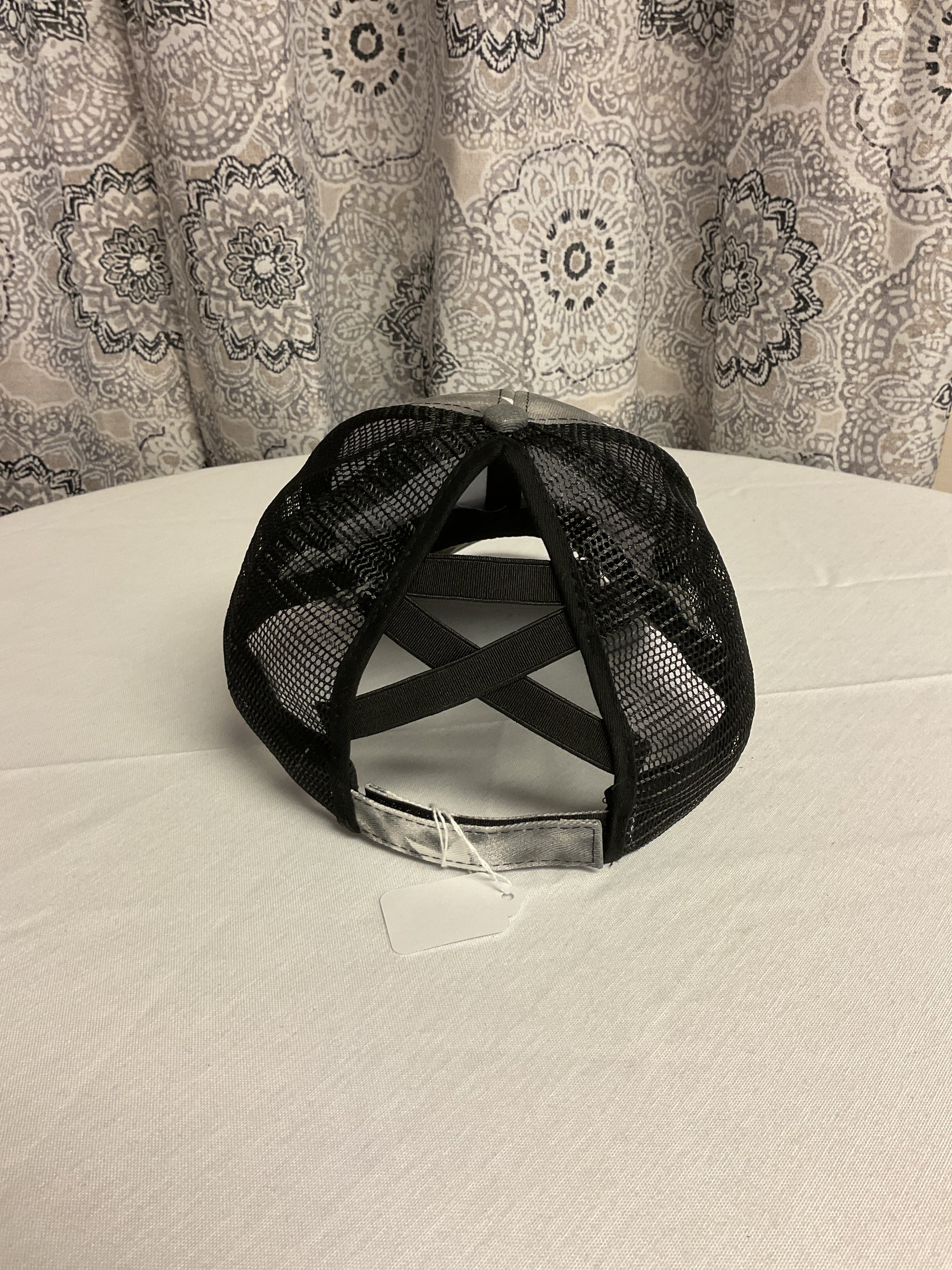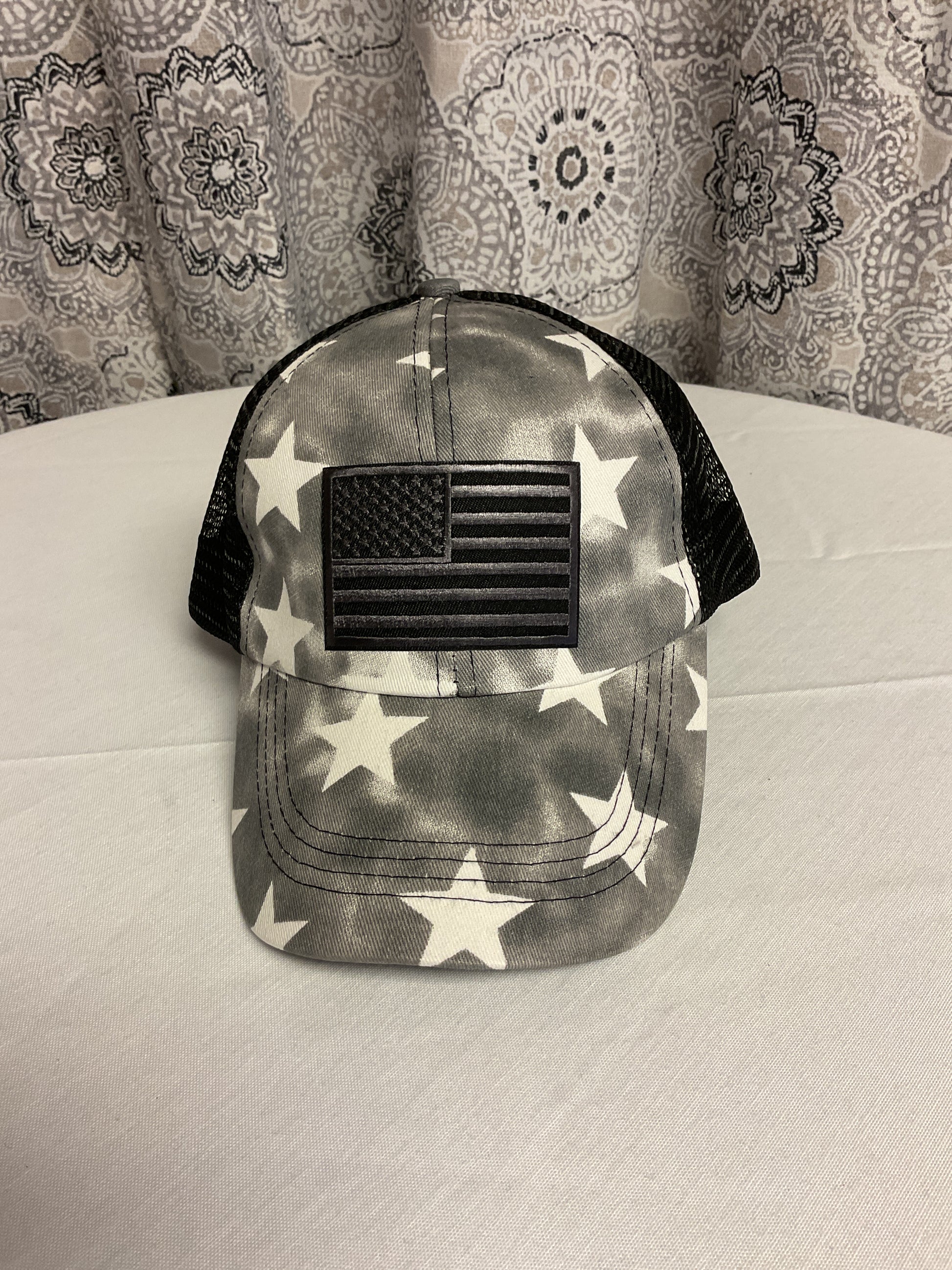 This exquisite ball cap features the iconic American flag in black, gray, and white, adorned with stars. The perfect accessory for the sophisticated and exclusive woman, it even comes with a holder for ponytails.