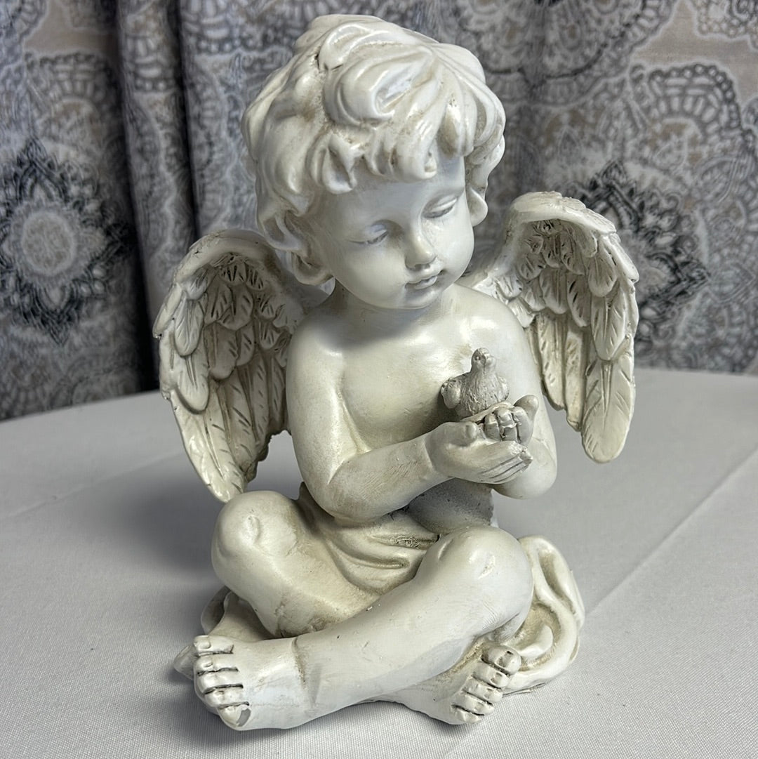 This 8 inch tall angel statue showcases an intricate design of a serene angel holding a bird with its legs crossed. Perfect for any home or garden, this 5 inch wide statue exudes a tranquil and spiritual vibe, making it a beautiful addition for those seeking peace and positivity in their surroundings.