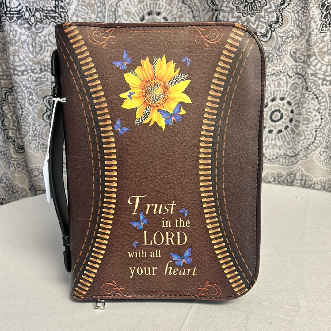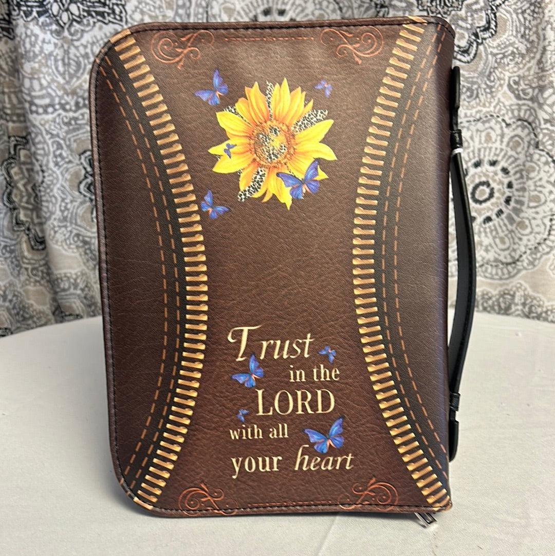 This imitation leather Bible cover with butterflies and a sunflower features “Trust in the Lord with all your heart” and can fit most standard-sized bibles and books up to 6 1/2 x 9 1/2 inches. With its durable material and inspirational message, it is the perfect accessory for protecting and carrying your bible with you wherever you go.