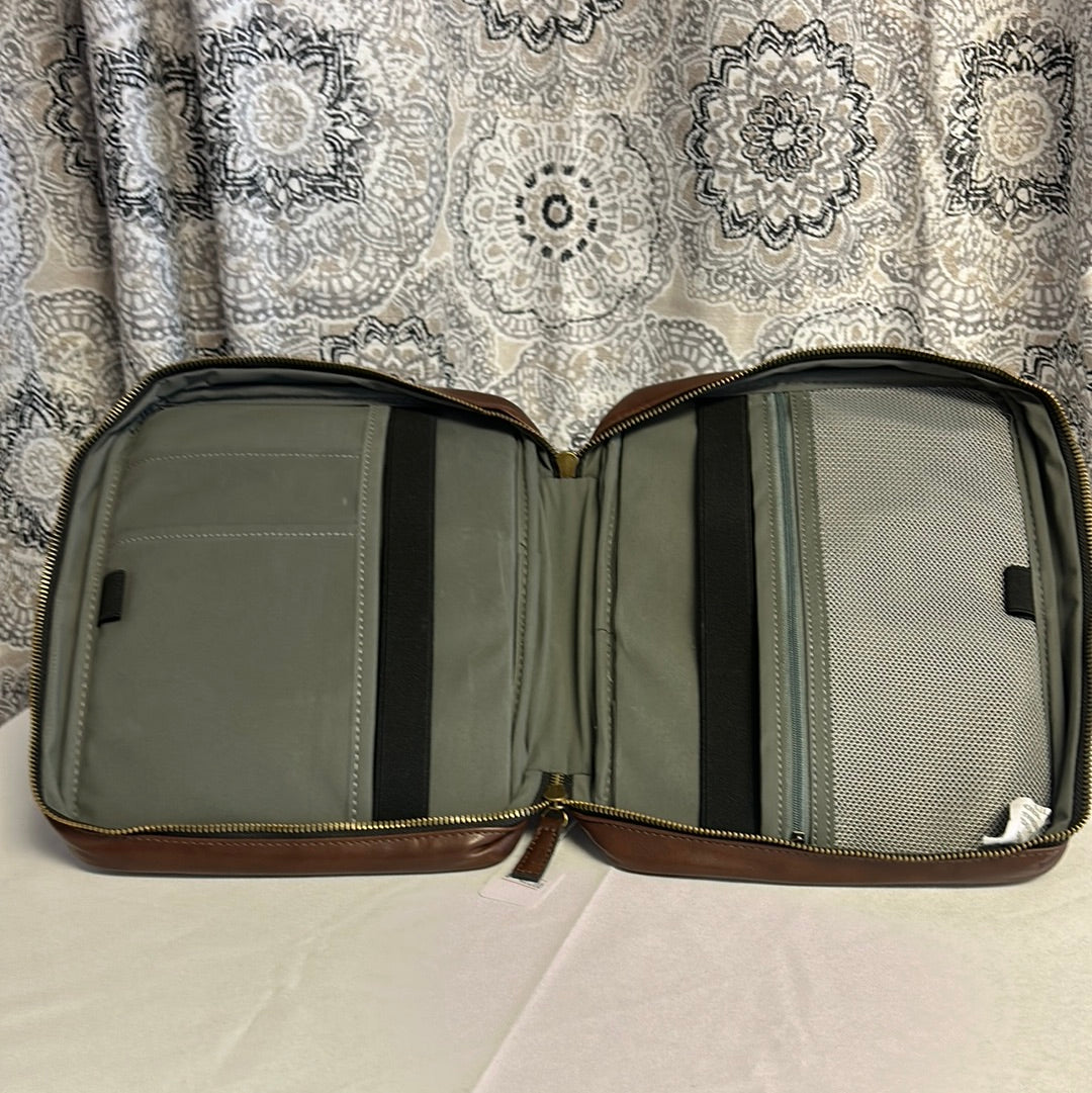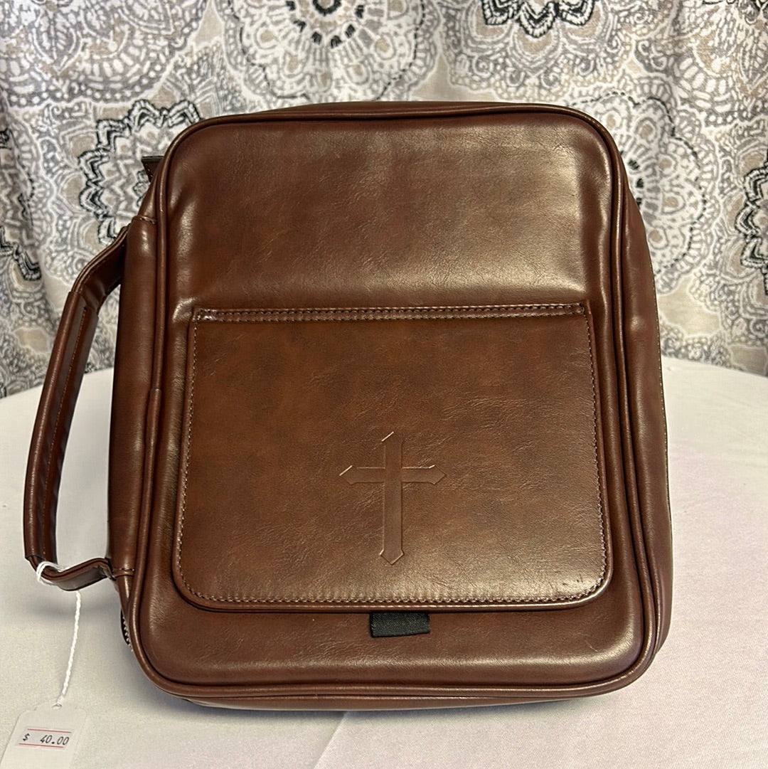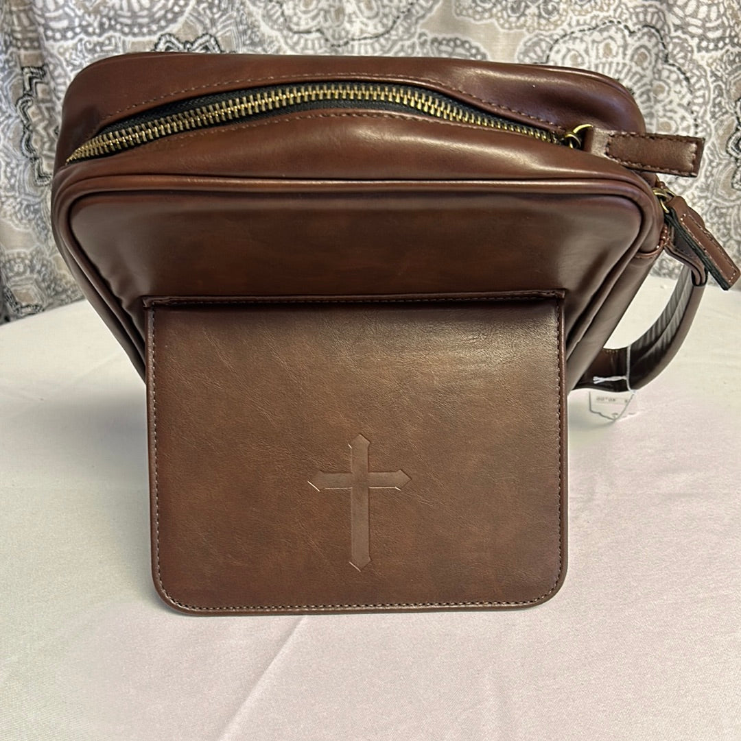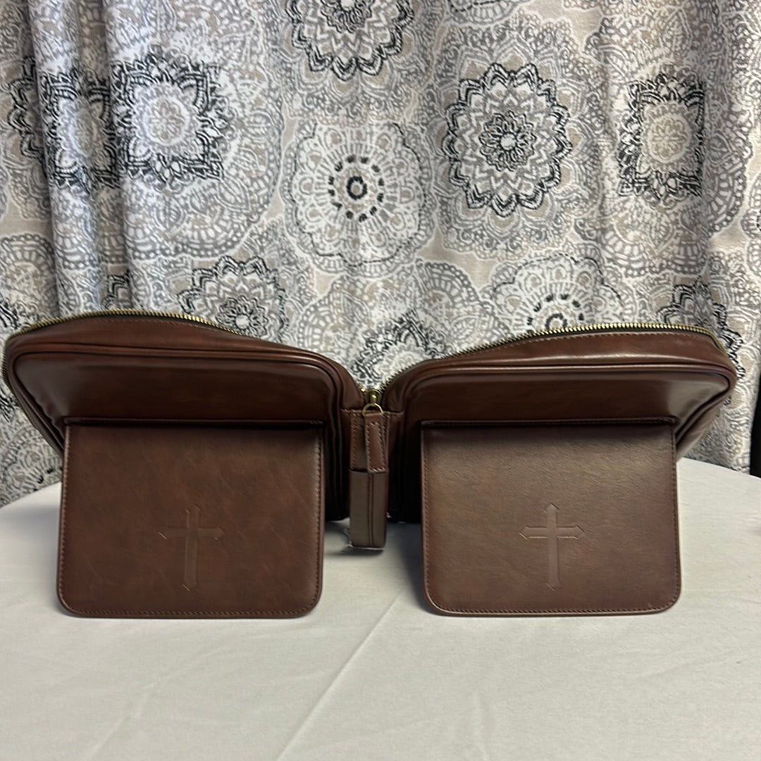 This high-quality Bible cover is made of brown leather and features a kickstand on both sides with a cross for convenient reading access. Measuring at 10 inches by 8 inches, it is the perfect fit for your Bible.