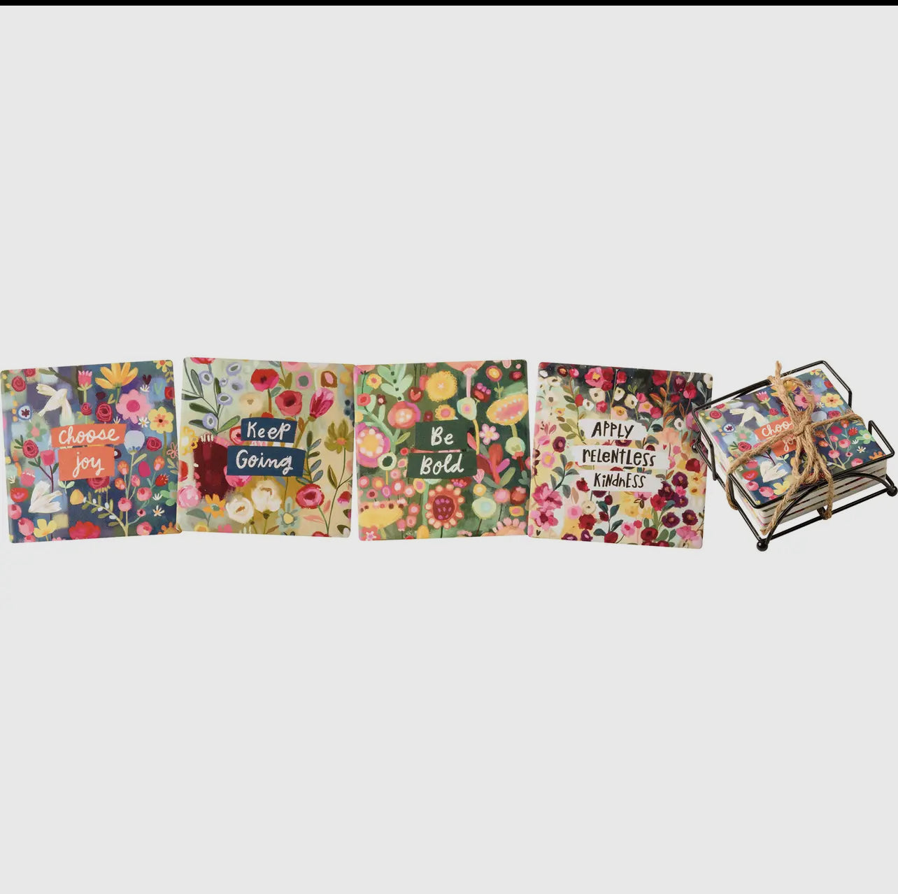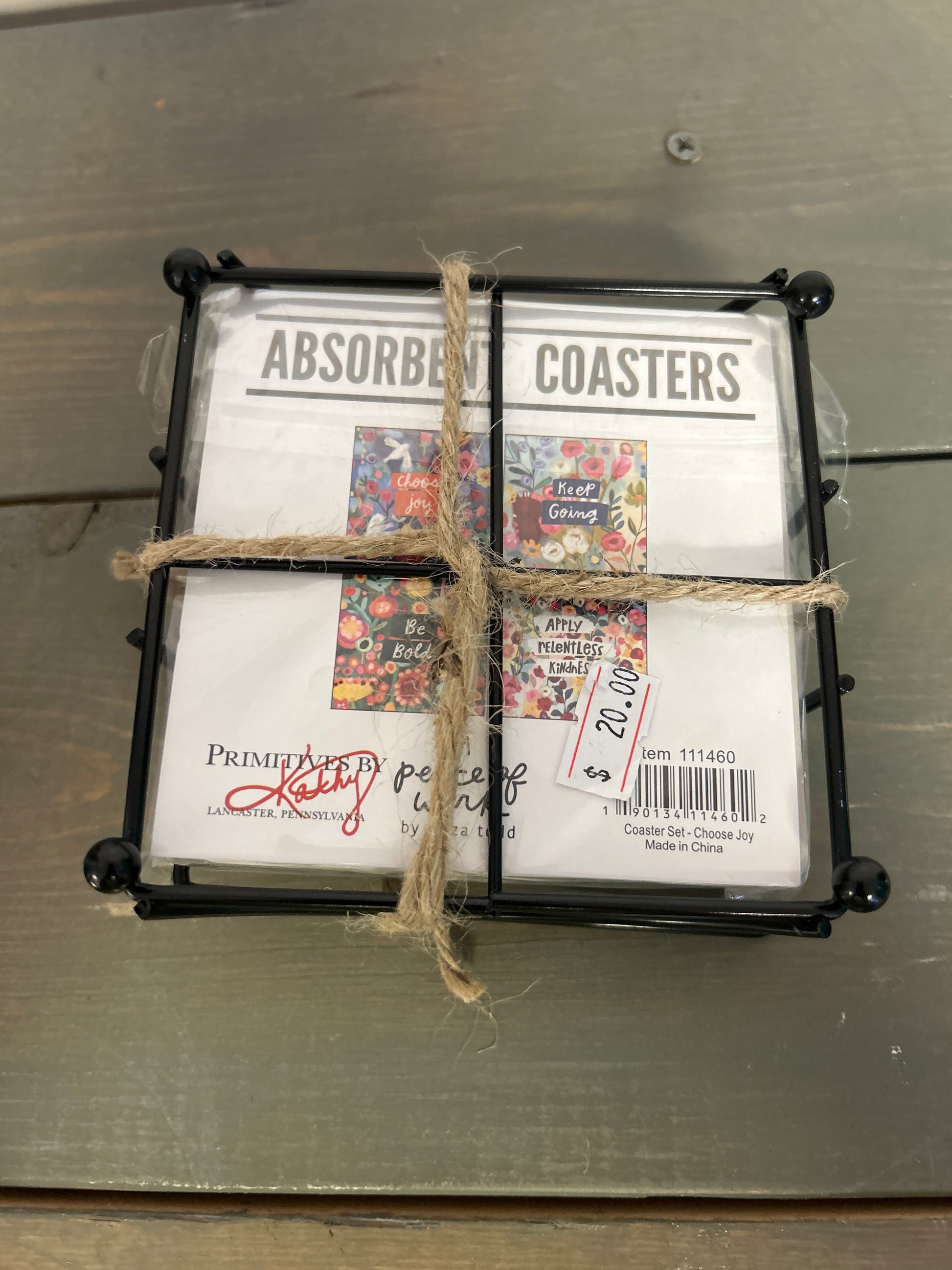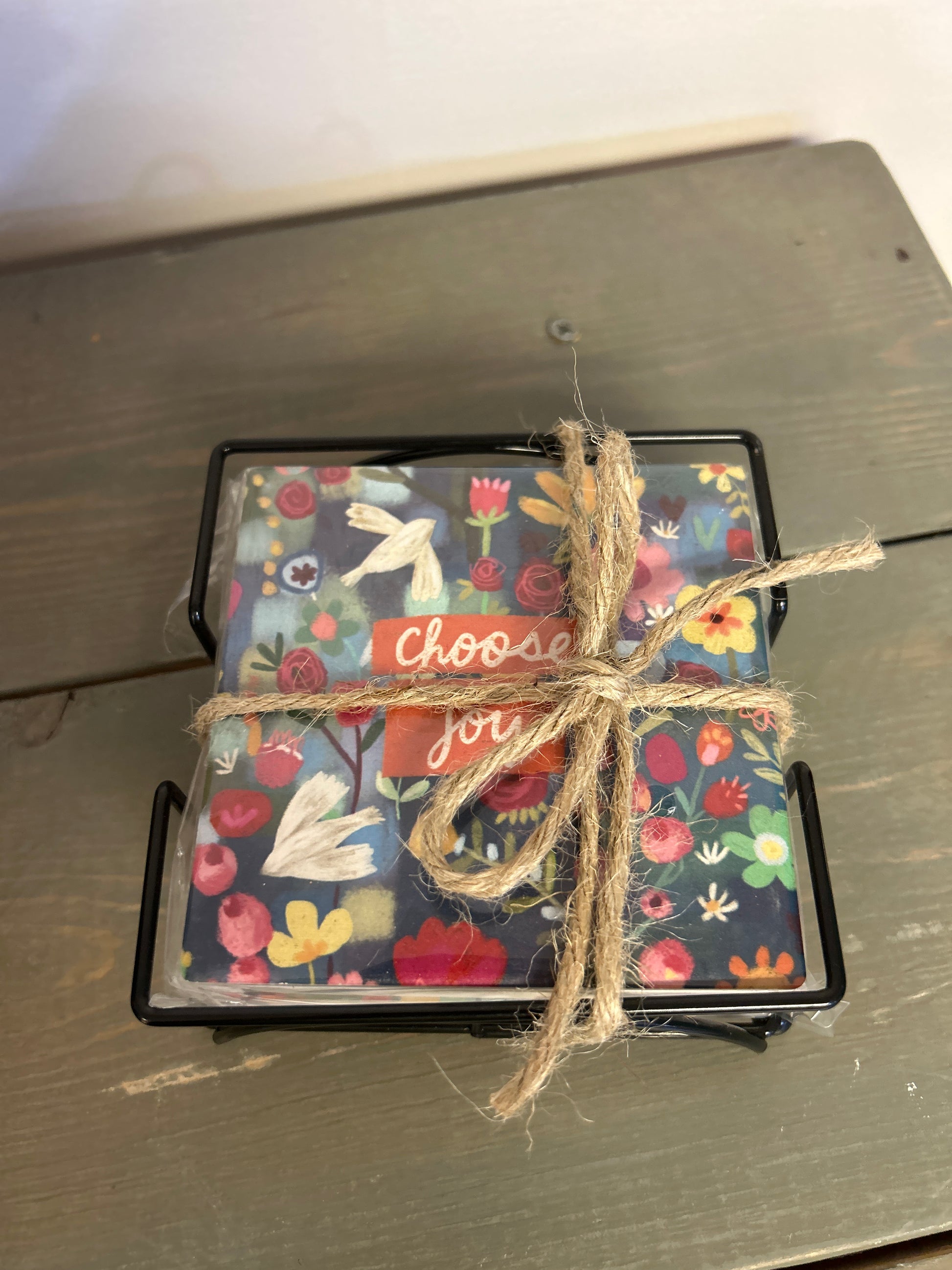 Add some joy to your home with our Choose Joy Coaster Set with Holder. These absorbent coasters are the perfect size at 4 x 4 inches, making them both functional and stylish.