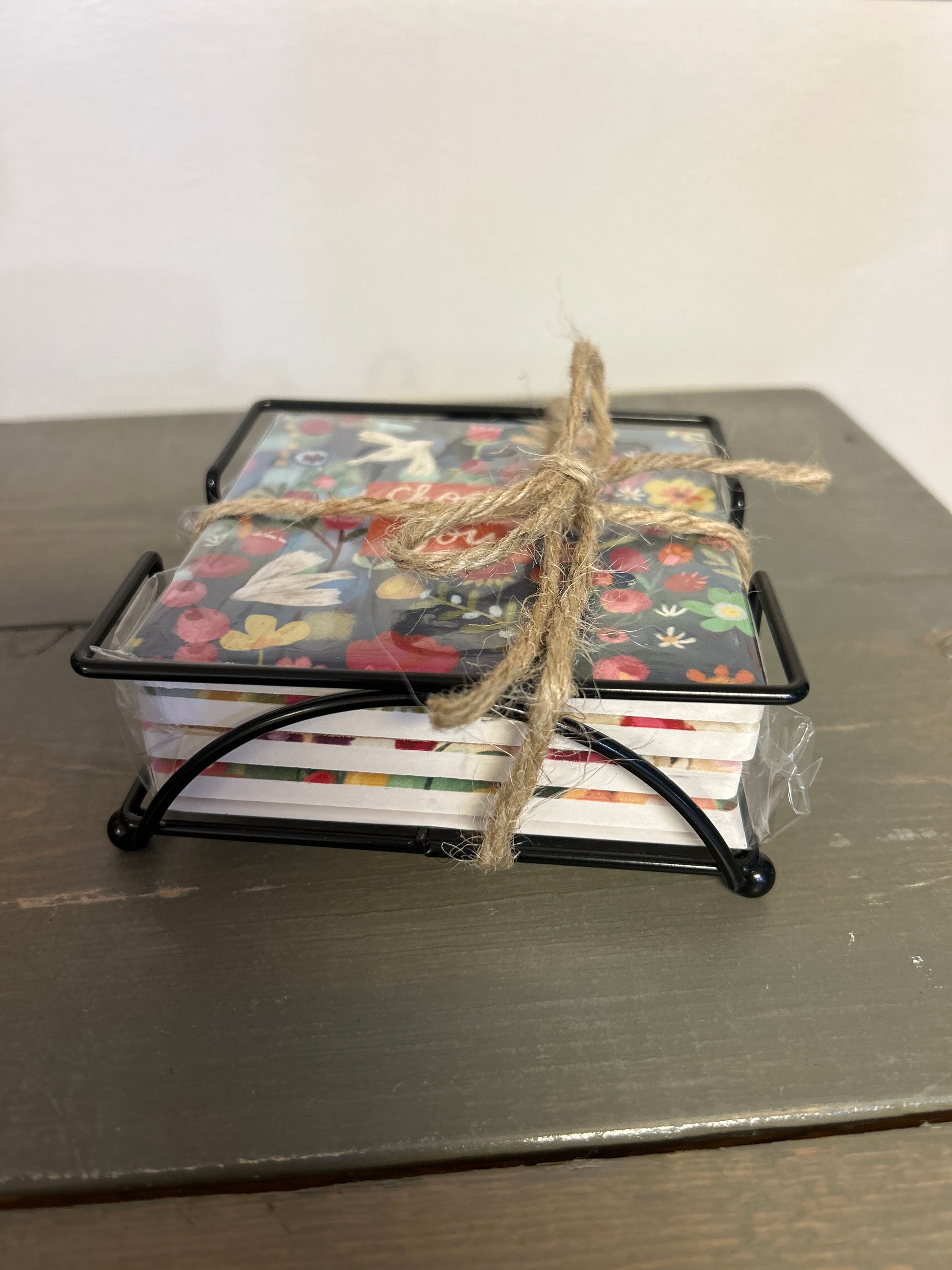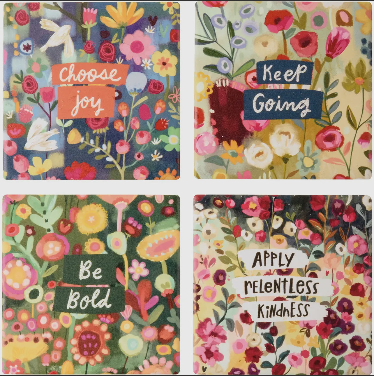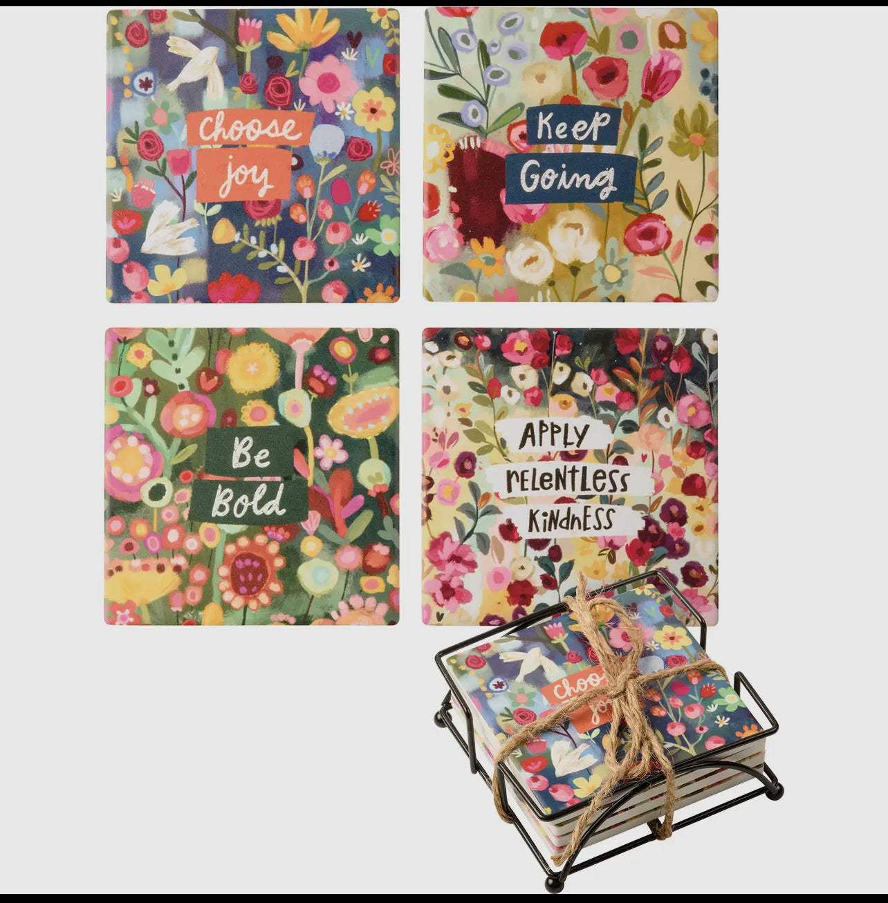 Add some joy to your home with our Choose Joy Coaster Set with Holder. These absorbent coasters are the perfect size at 4 x 4 inches, making them both functional and stylish.