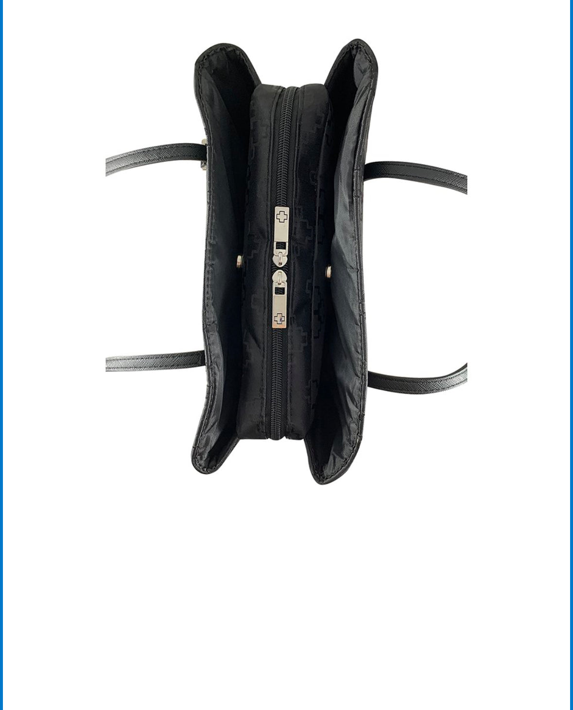 Purse style Bible tote, carry the Word of God with fashionable and faith focused bag. Black with geometric cross pattern design and gold-tone accents.
