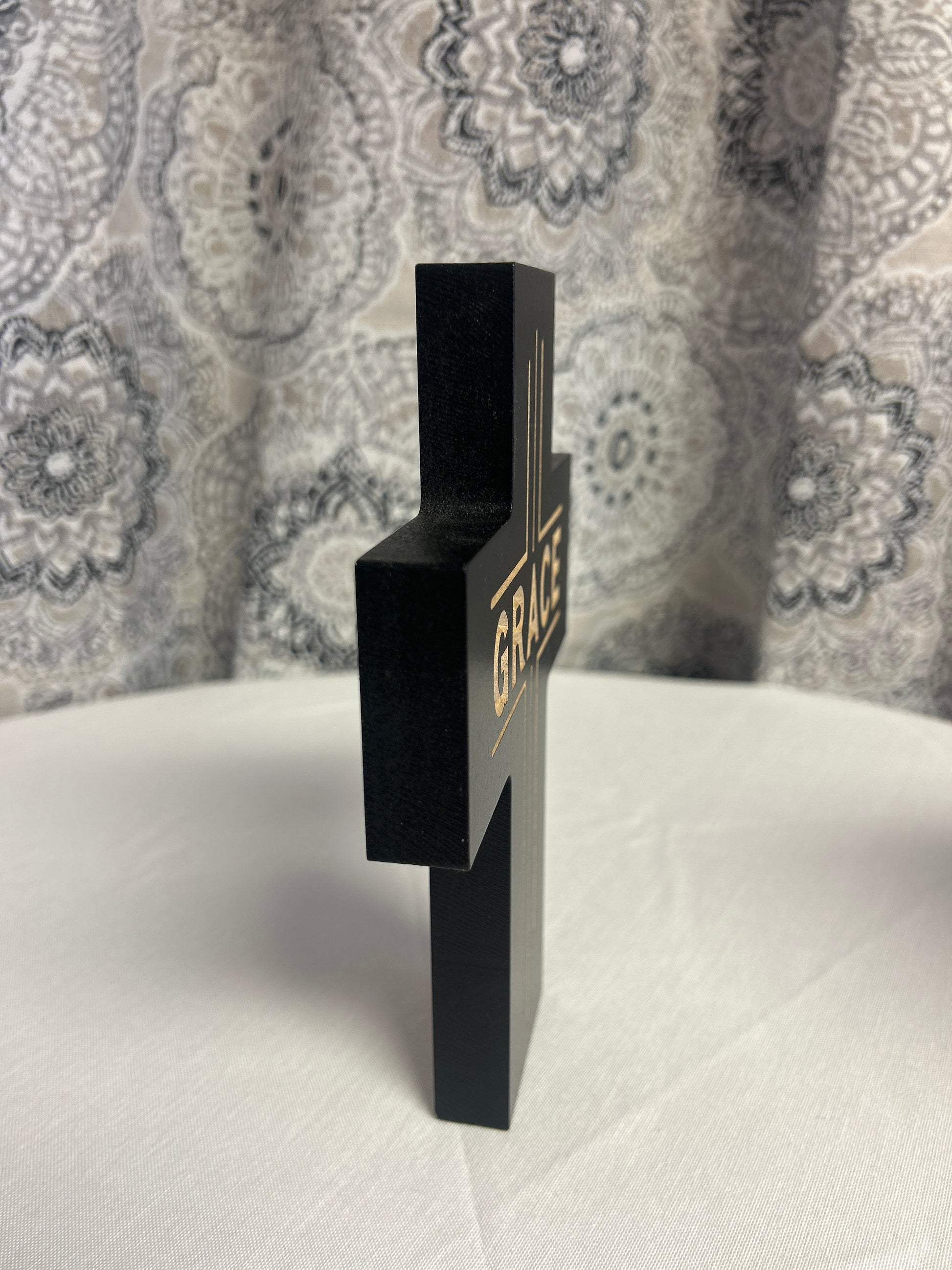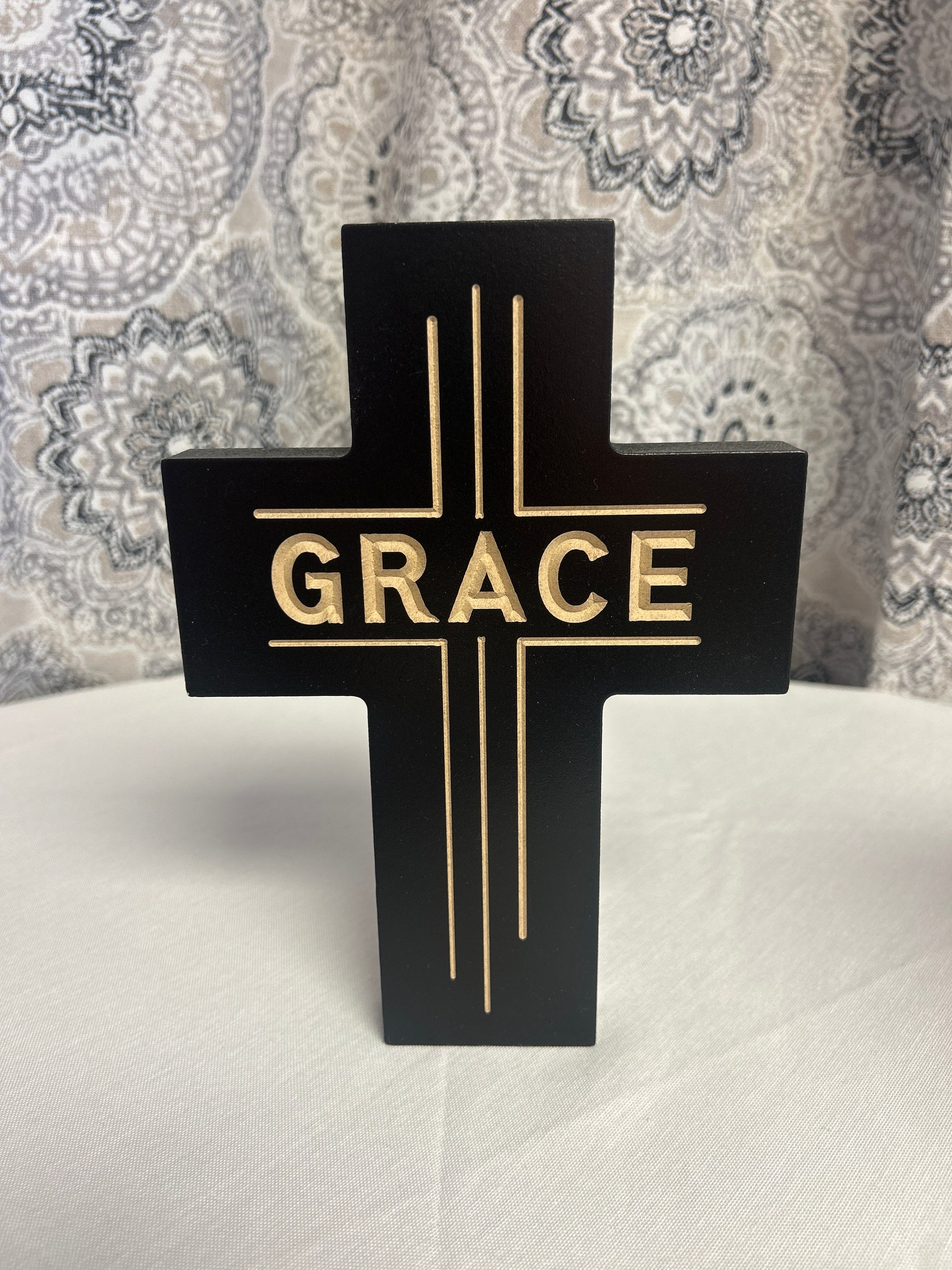 An elegant and meaningful addition to any space, this engraved plaque features a Cross with Grace design. Measuring 8 x 5 1/2 inches, it is the perfect size for displaying on a wall or shelf.