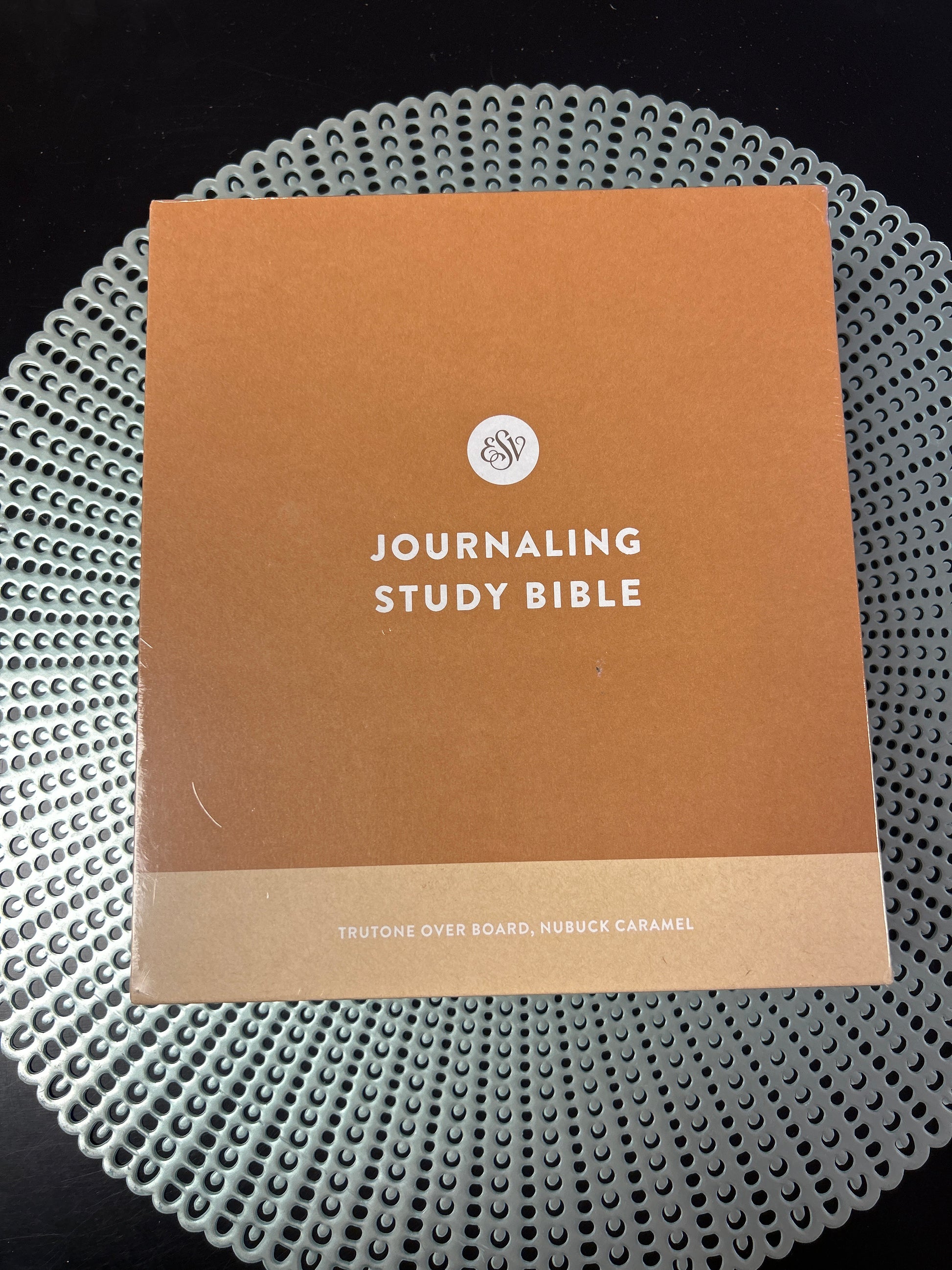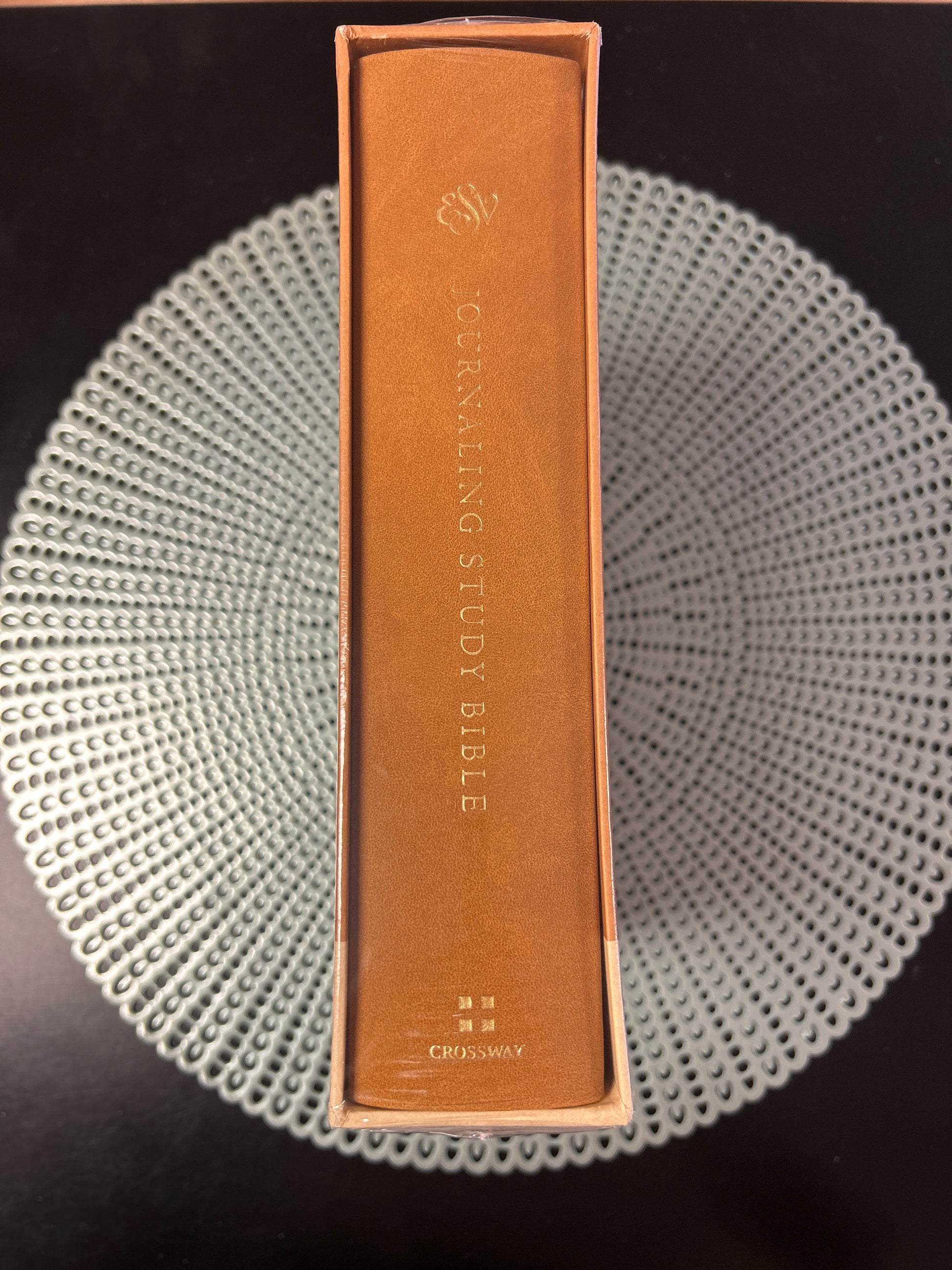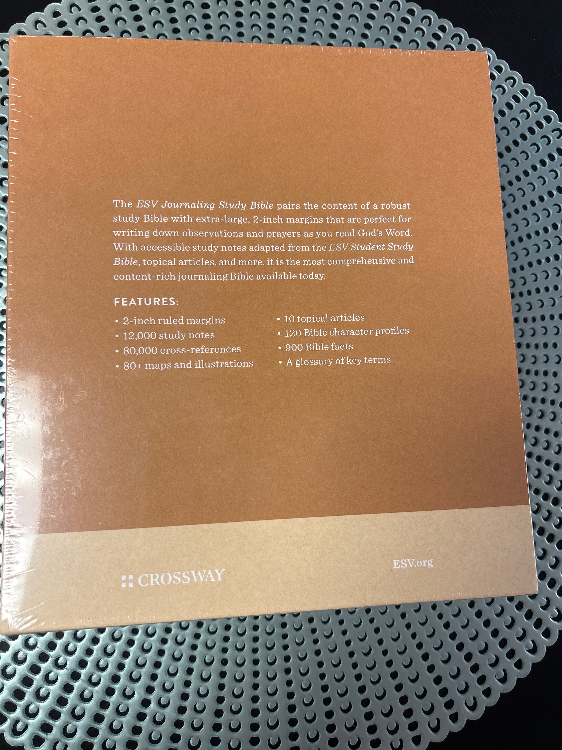 The ESV Journaling Study Bible features a durable trutone cover in a rich nubuck caramel color. Measuring 7 and a half by 8 and a half inches, it offers ample space for personal notes and reflections.