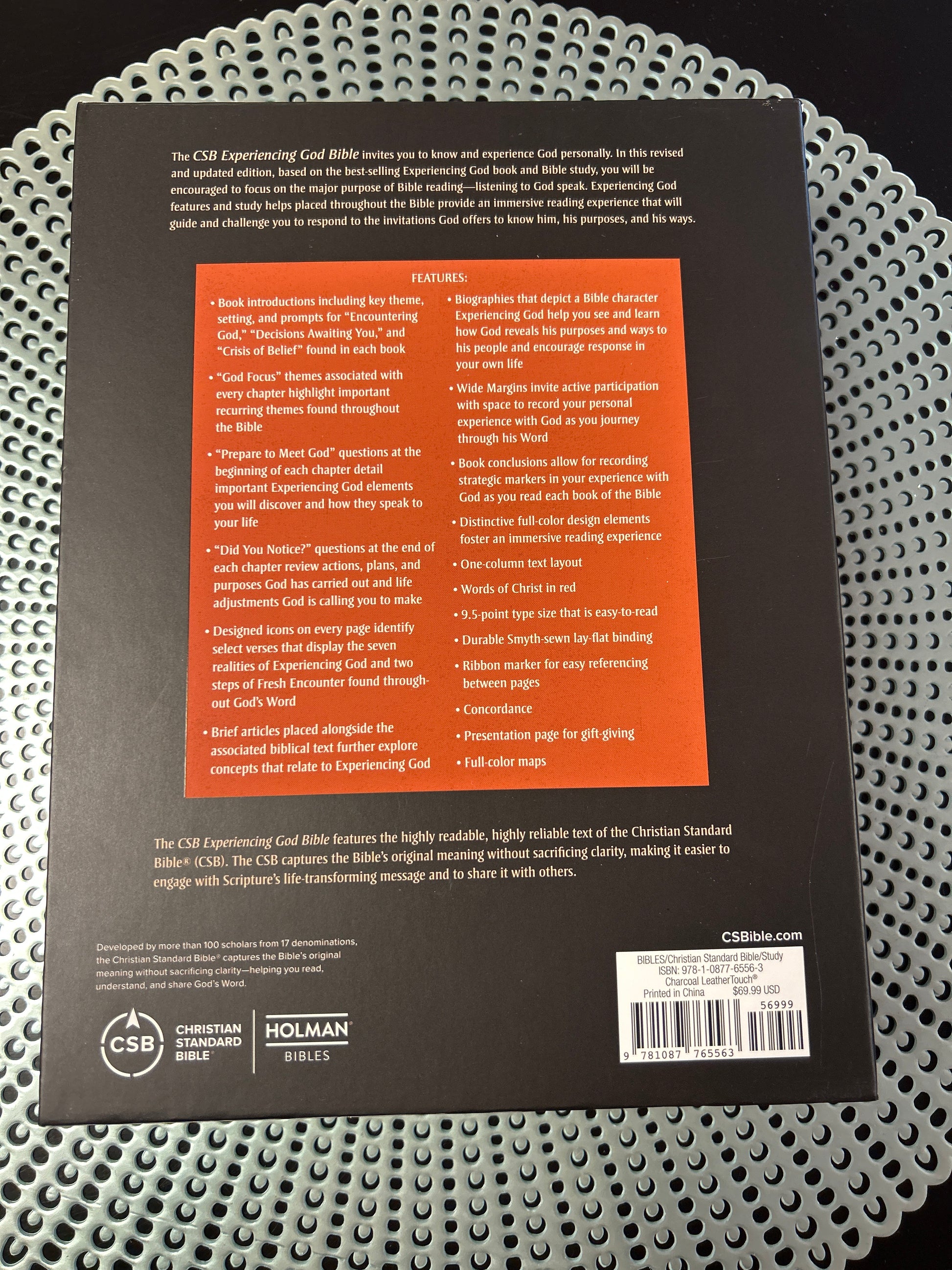 The CSB Experiencing GOD Bible allows you to discover and fulfill the divine plan. With its luxurious charcoal leather cover and smooth touch, this 7 x 9 1/2 inch book is a must-have for those seeking a higher understanding.