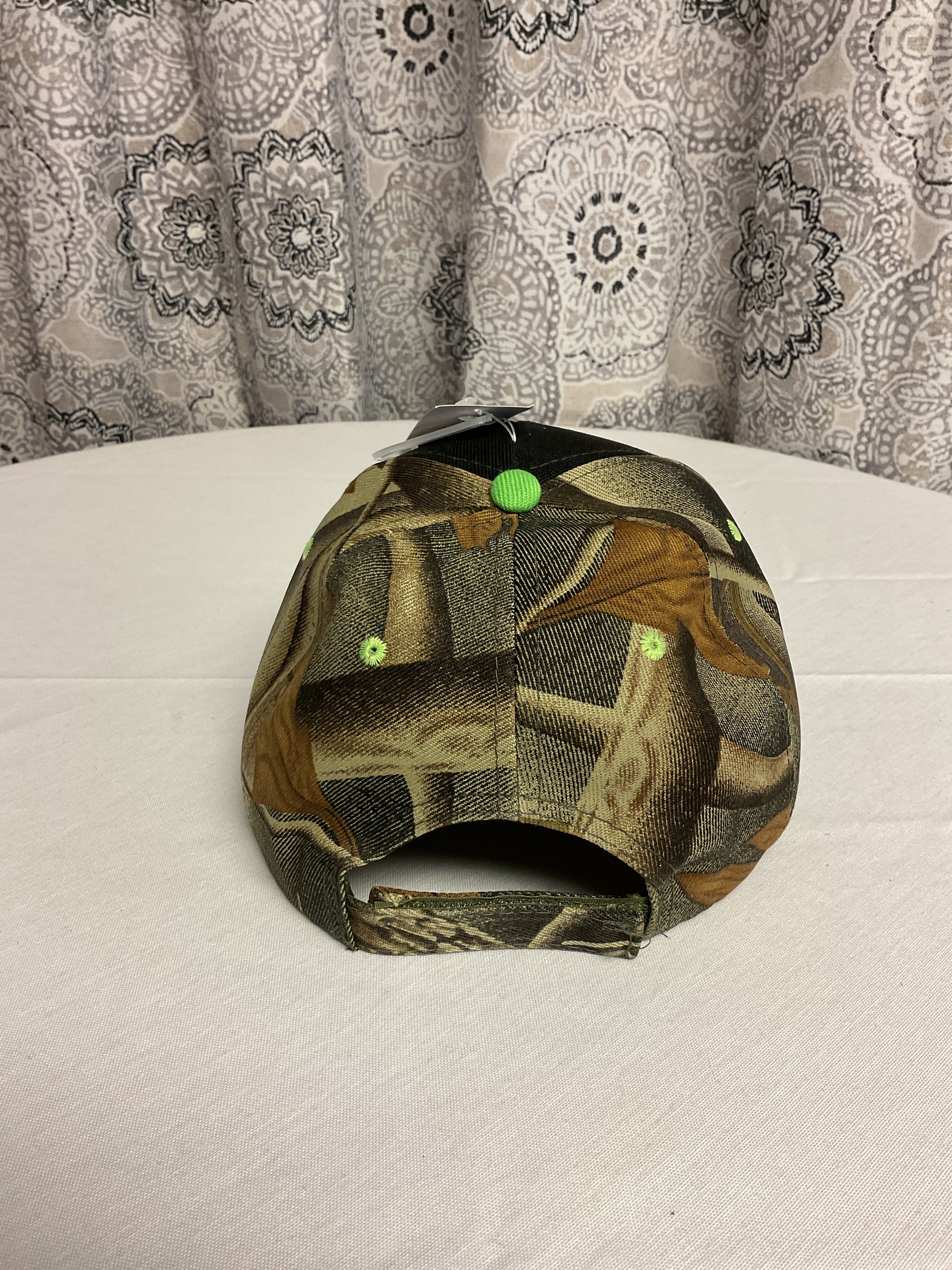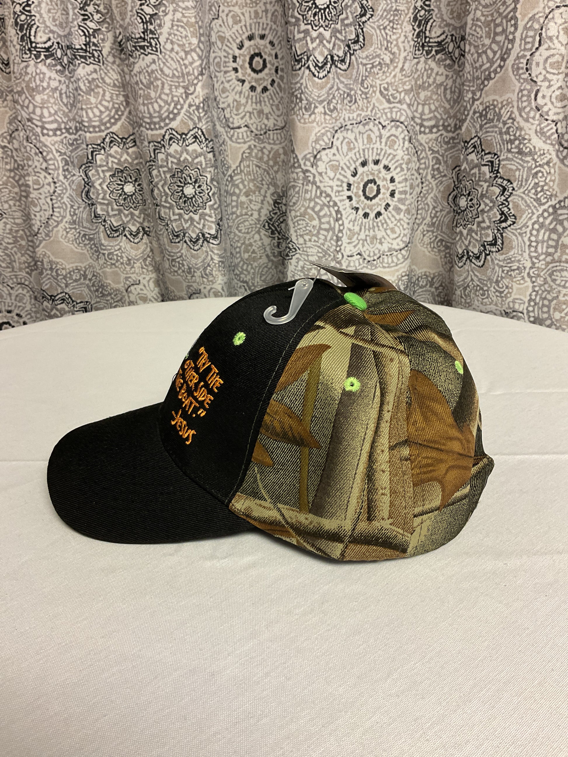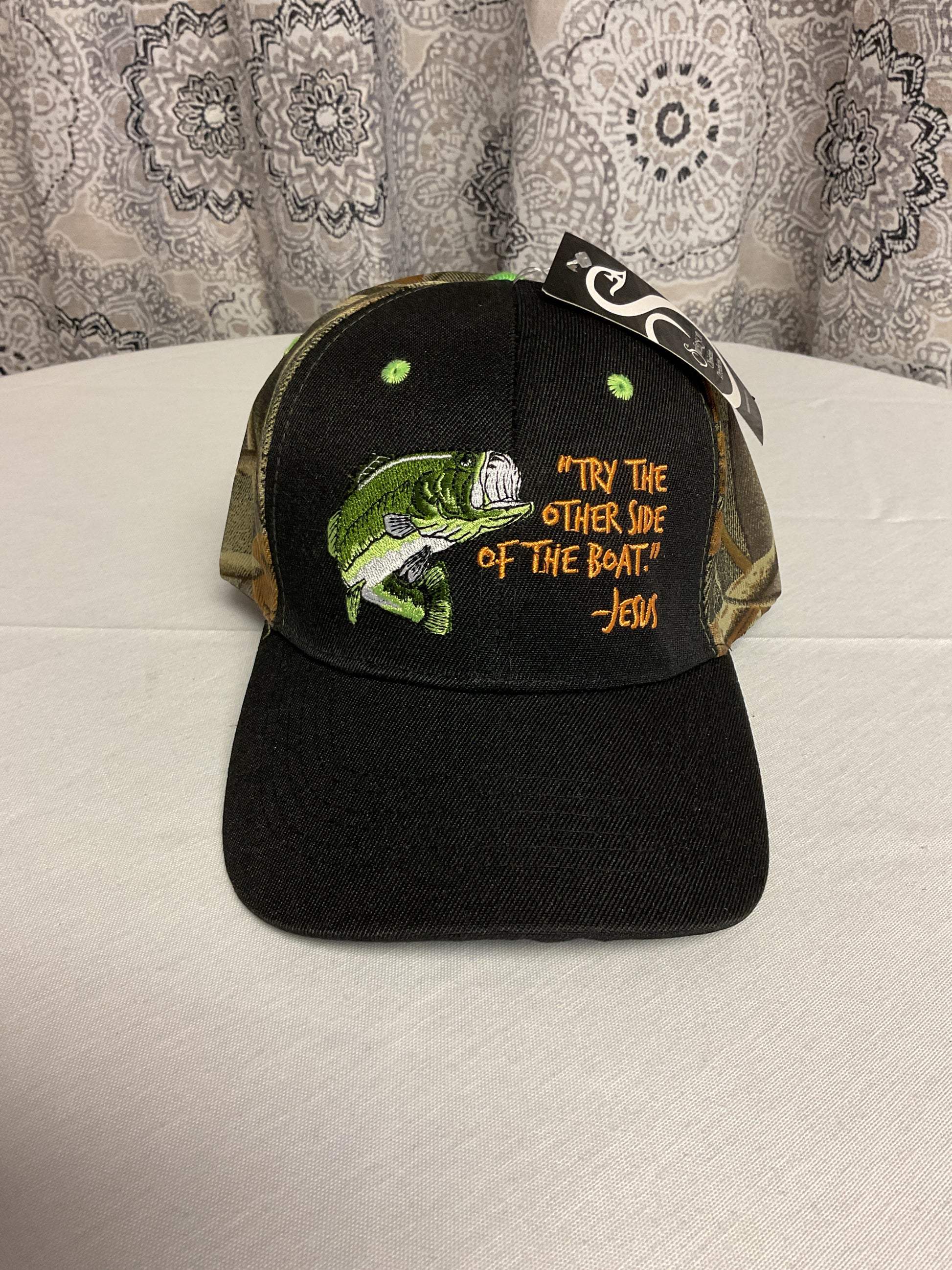 "Experience the thrill of reeling in a big catch with our camouflauge and black cap, featuring a majestic fish design. Don't forget to try the other side of the boat and see what you can catch - it's all part of the adventure! And with a subtle nod to Jesus, you'll find even more meaning in your fishing expeditions."