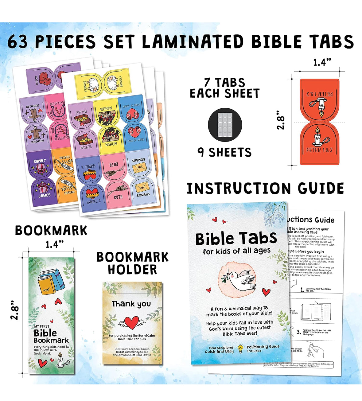 - โ๏ธ HELP YOUR LITTLE GUYS LEARN THE BOOKS OF THE BIBLE. Large font Bible study supplies for easy reading are perfect for helping children get comfortable using the Bible. No more going back to the table of contents! Our set includes 9 sheets with 60 books cute Bible tabs for Old and New Testament plus THREE blank tabs which can be personalized, 1 magnetic bookmark and 1 tab alignment guide.