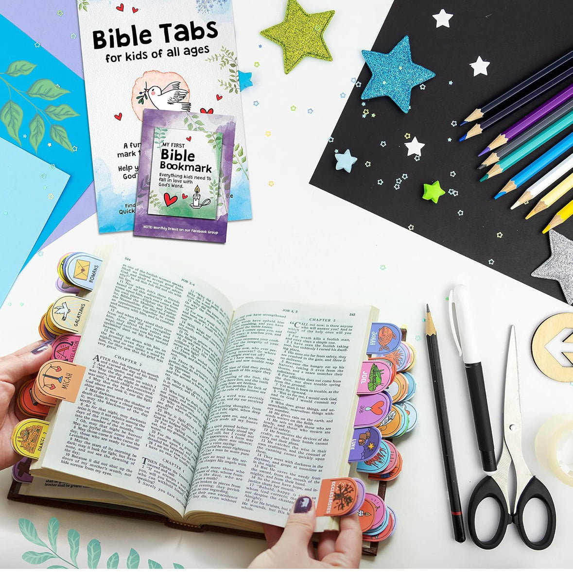 - โ๏ธ PEEL OFF AND STICK WHEREVER YOU WANT, DONE! Our set includes 63 Bible chapter tabs pre-cut and self-adhesive, so simply align them with the provided guide or place them creatively. The tabs for Bible chapters are pre-scored for easy folding. This set can make the perfect gift choice along with a kids Bible cover for boys and a kids Bible case.