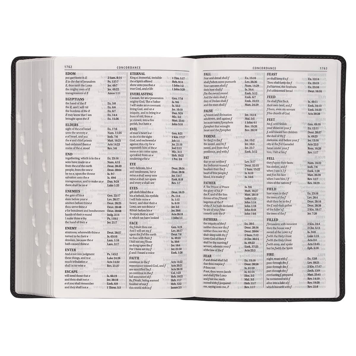 The classic King James Version Bible is printed in giant print and presented in a decidedly modern look in the Black Two-tone Faux Leather Giant Print Bible with Thumb Index. The spine and corners of the faux leather Bible cover are wrapped in black leather-textured faux leather, and attached to the smooth dark charcoal gray faux leather panels of the front and back covers with gray top stitching. Similar stitching reinforces the edges of the quarter-bound flex cover Bible. The title is heat debossed and accented by a quatrefoil fleur-de-lis design. Holy Bible The leather-textured black faux leather spine is decorated with silver foiled and heat debossed faux spine ribbing and subtly heat debossed fleur de lis finial designs that spill over onto the front and back covers. Here, the title, version reference and faux spine ribs are foiled in silver.