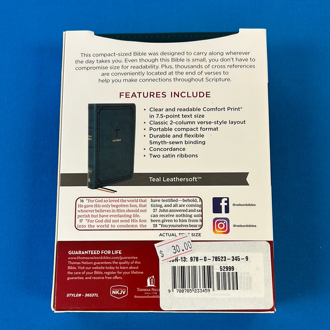Discover the exquisite beauty and sophistication of the NKJV Compact Reference Bible in luxurious teal leather. Measuring at 5 x 61/2 inches, this soft leather bible exudes elegance and exclusivity, making it the perfect companion for those with refined taste.