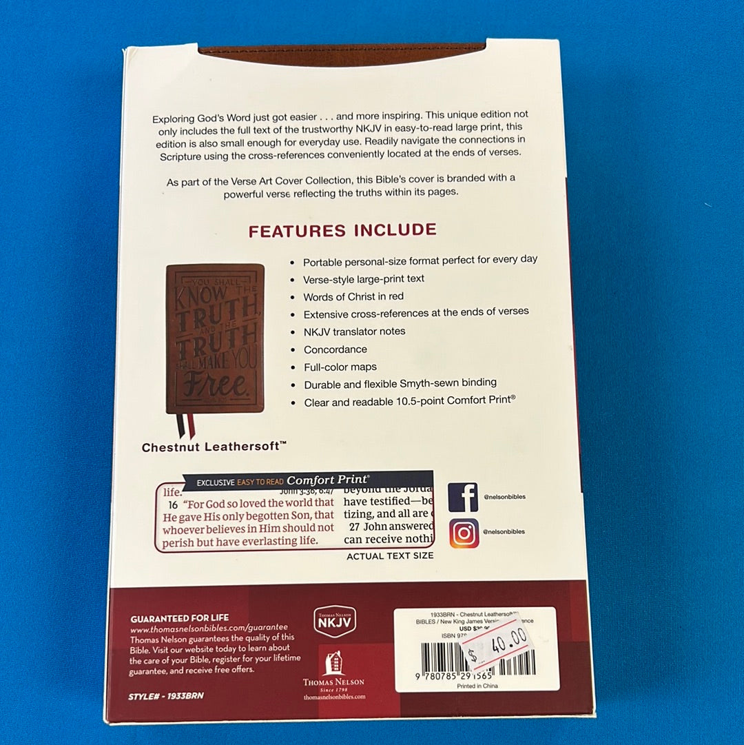 Indulge in the opulent beauty of the NKJV Verse Art Cover Collection Large Print End-Of-Verse Reference Bible, featuring a luxurious chestnut leather cover. The soft, supple material exudes sophistication and elegance, making it the perfect edition to add to your collection. Measuring 6 x 9 inches, it is the ideal size for both portability and display.