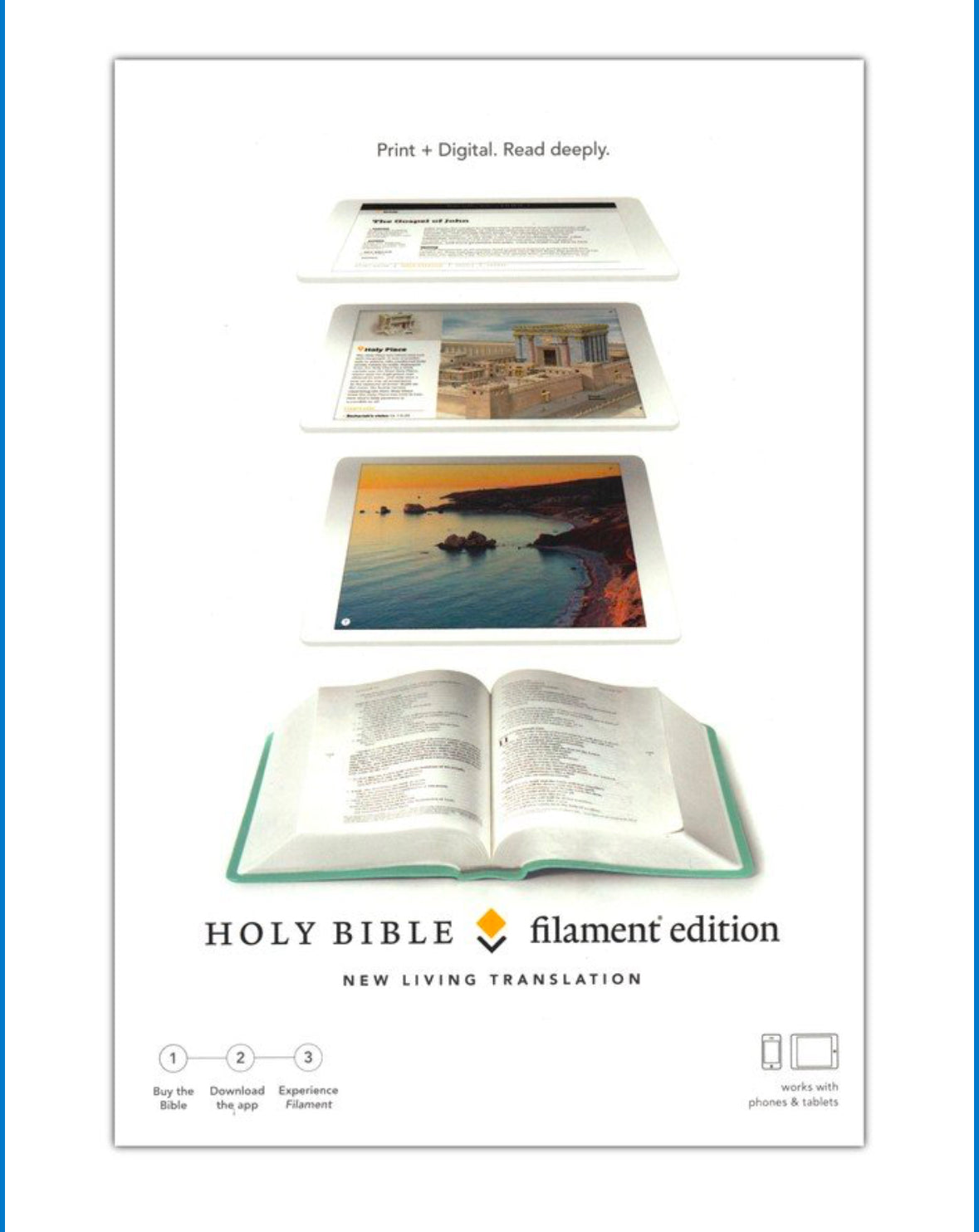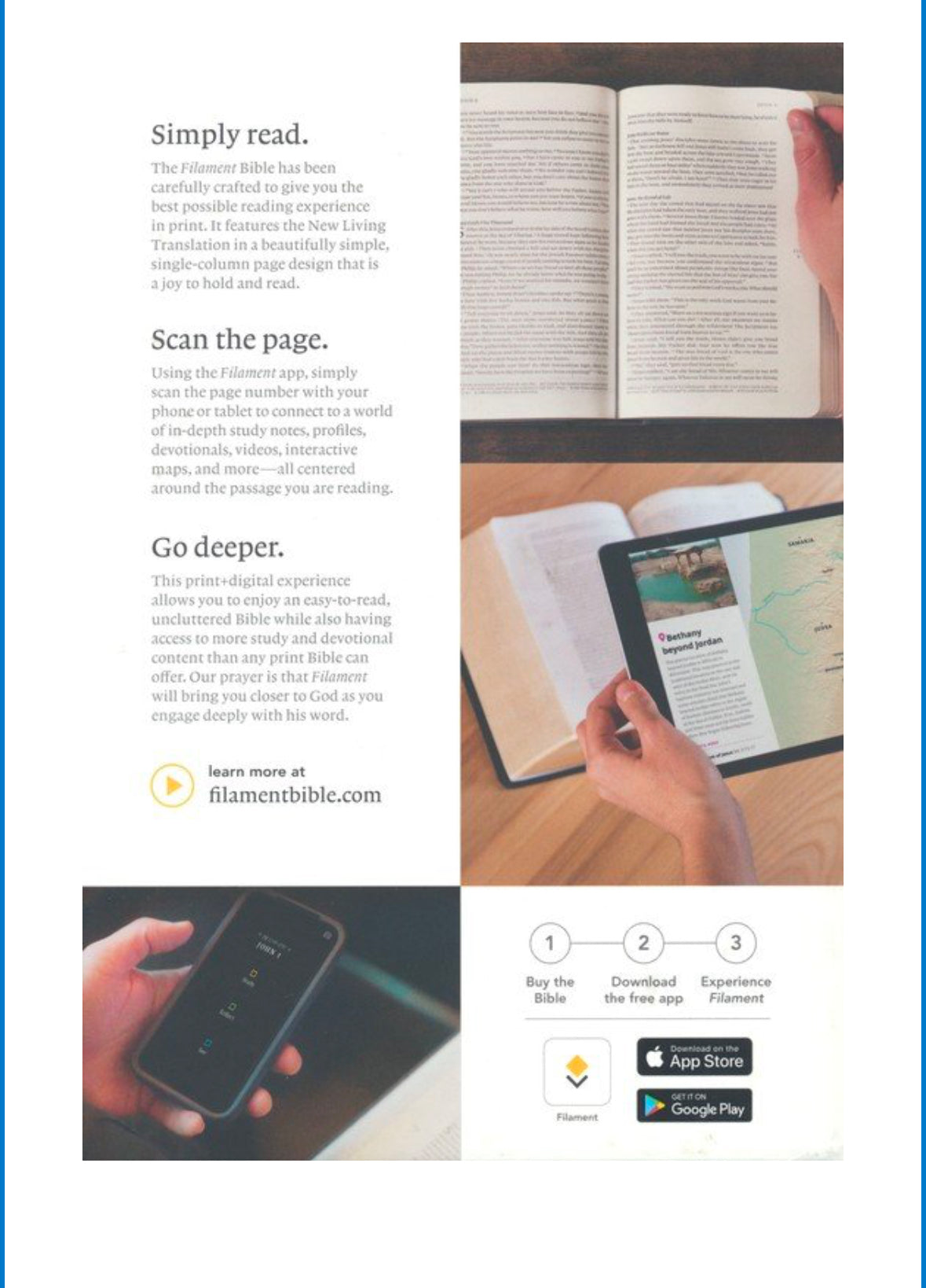 The NLT Filament Bible combines a beautifully printed compact Bible presented in a single column text format with the information-rich capability of the Filament app. Simply scan the page number with your phone or tablet to connect to a wealth of information: study notes, historical character profiles, devotionals, videos, interactive maps, and more - all focused on the specific passage you're reading.