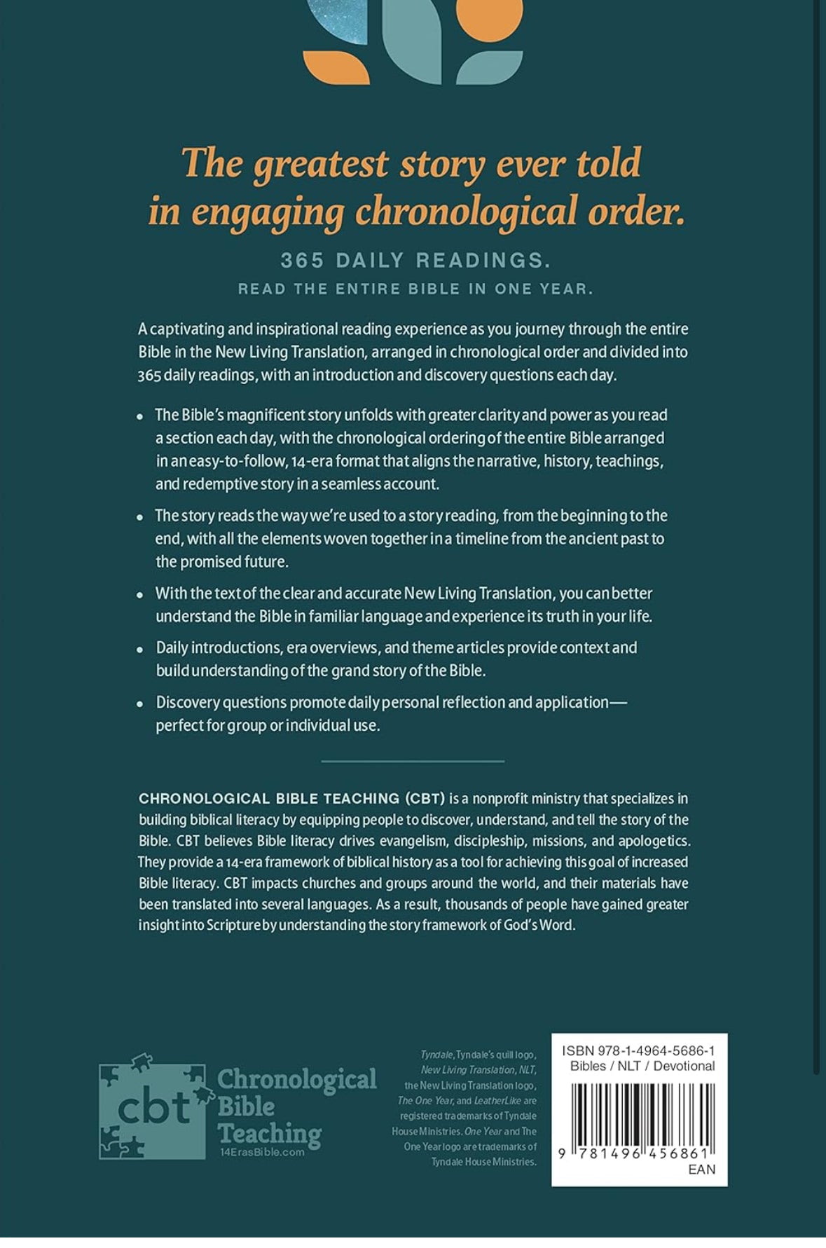 Discover God’s Word in a new light with this unique One Year Bible – broken down into manageable daily readings, ordered chronologically, and illuminated by study notes.