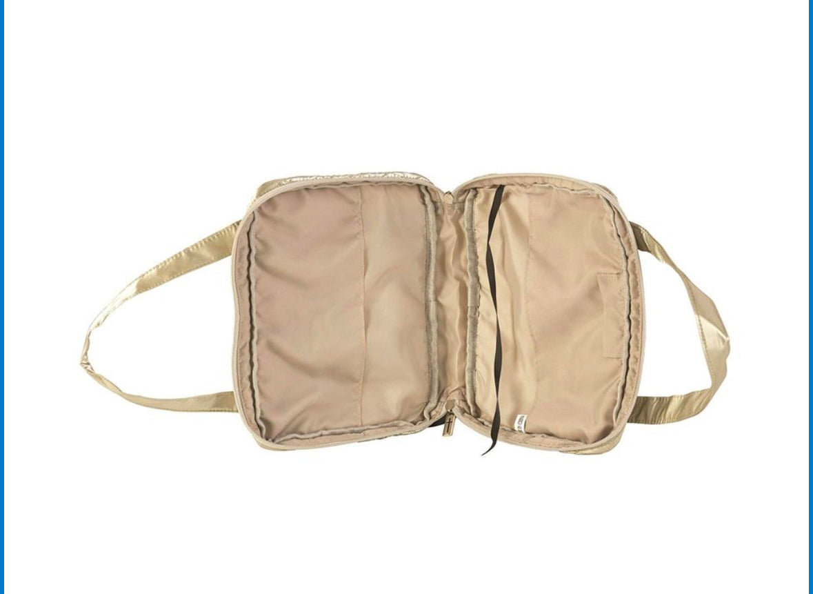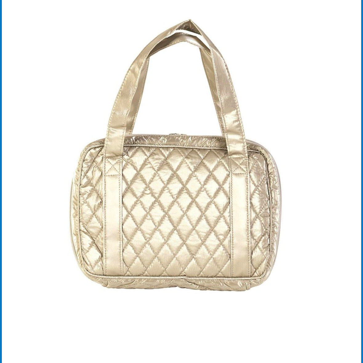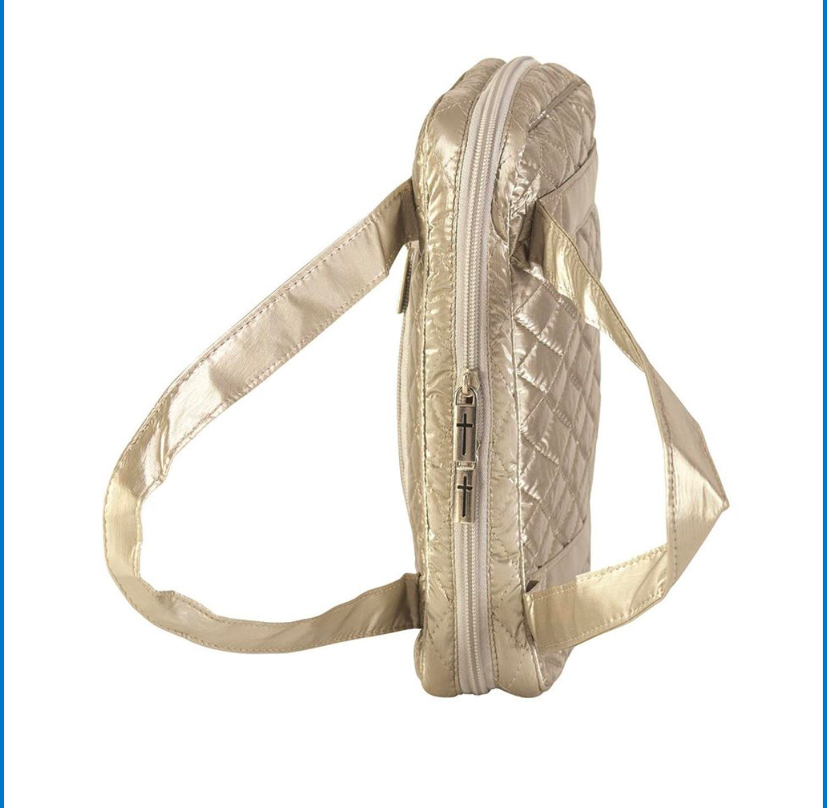 Purse style Bible cover, smooth quilted champagne-tone polyester.