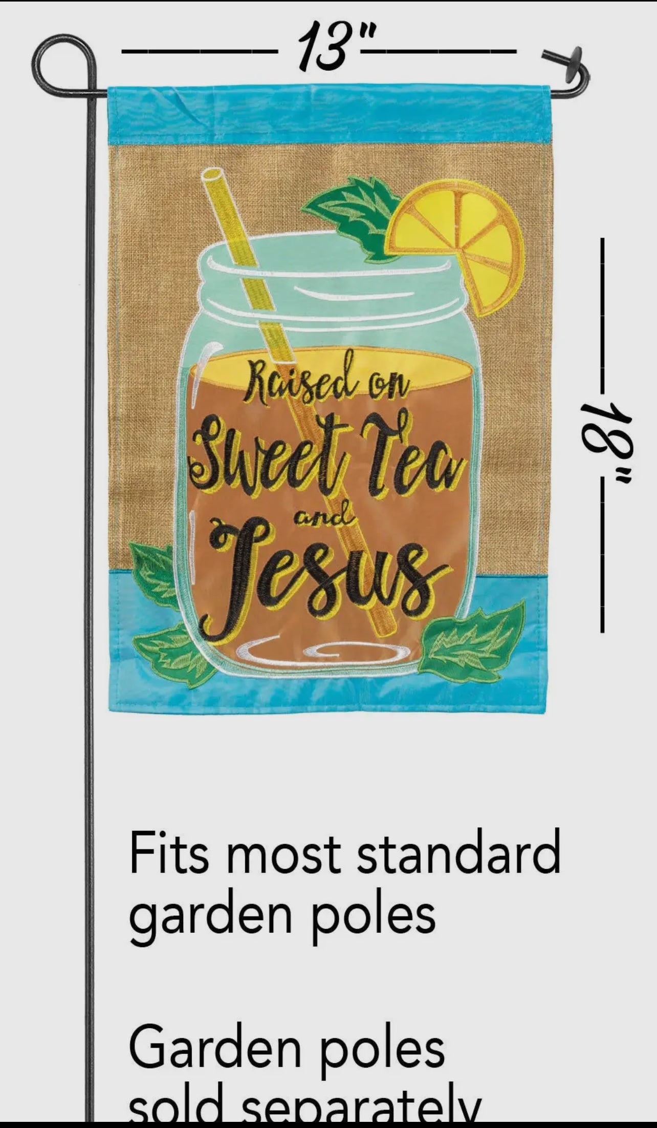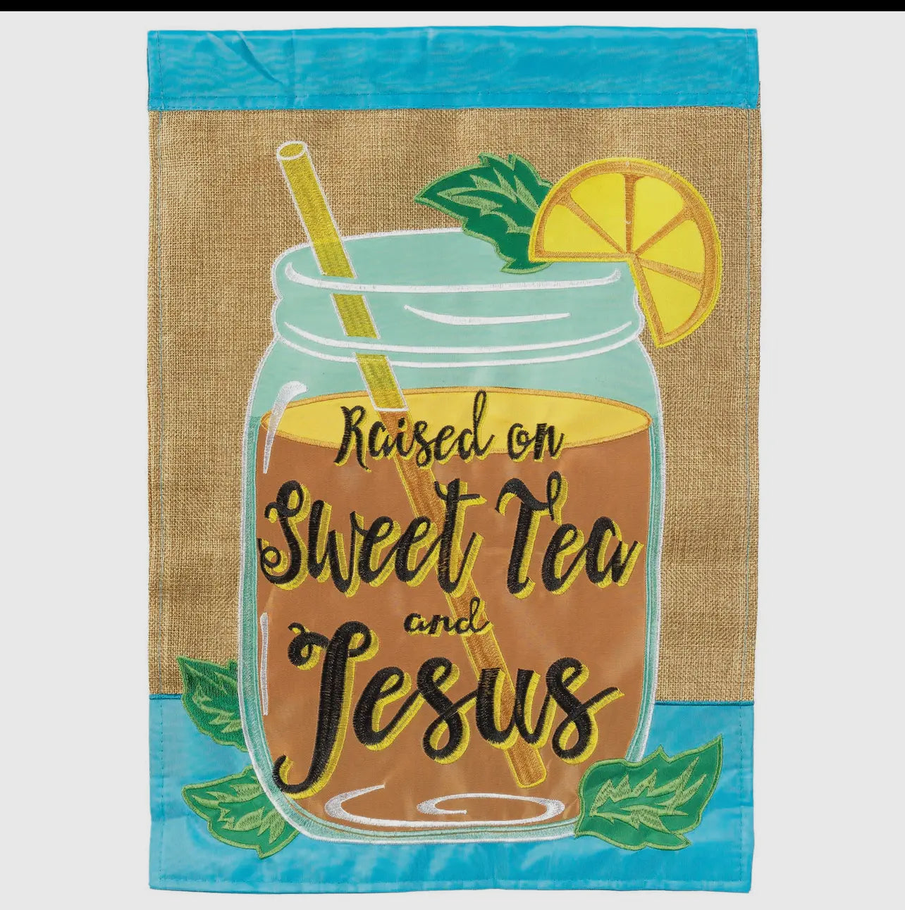 This exclusive Raised On Sweet Tea & Jesus Burlap Flag measures 13 x 18 inches, making it the perfect size for showcasing your Southern roots and faith.