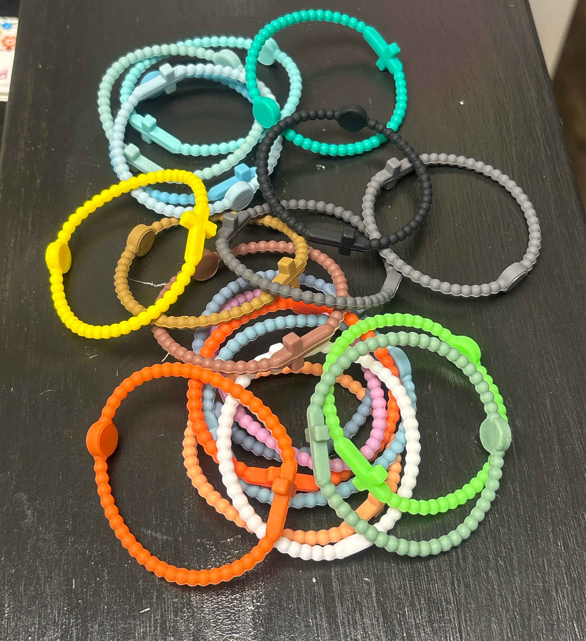 These silicone cross bracelets feature a beaded design and are available in two distinct colors.