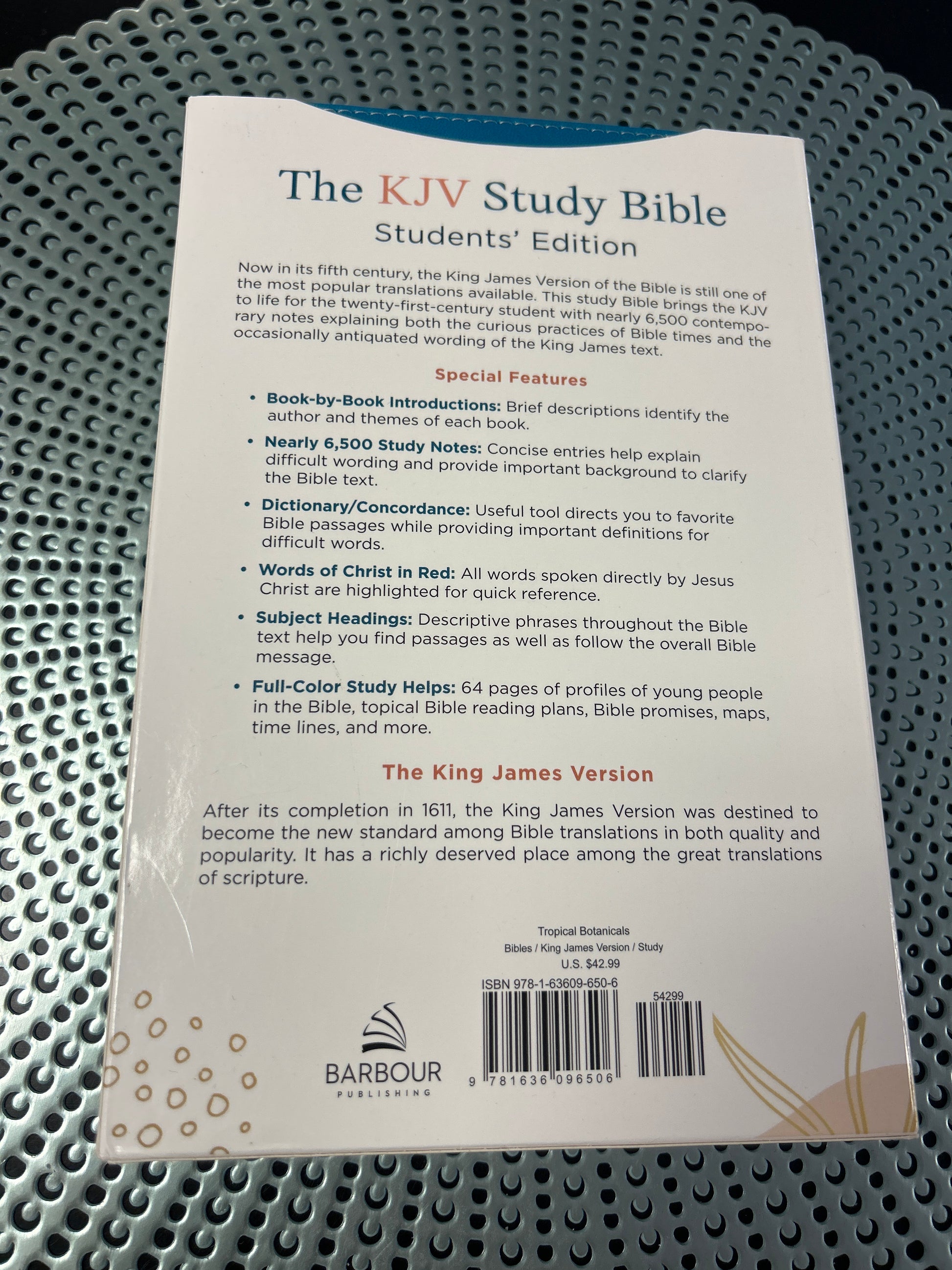 Get ready for an unforgettable learning experience with the KJV Study Bible Students’ Edition, featuring beautiful tropical botanicals and measuring 8.9x5.6x1.4 inches.