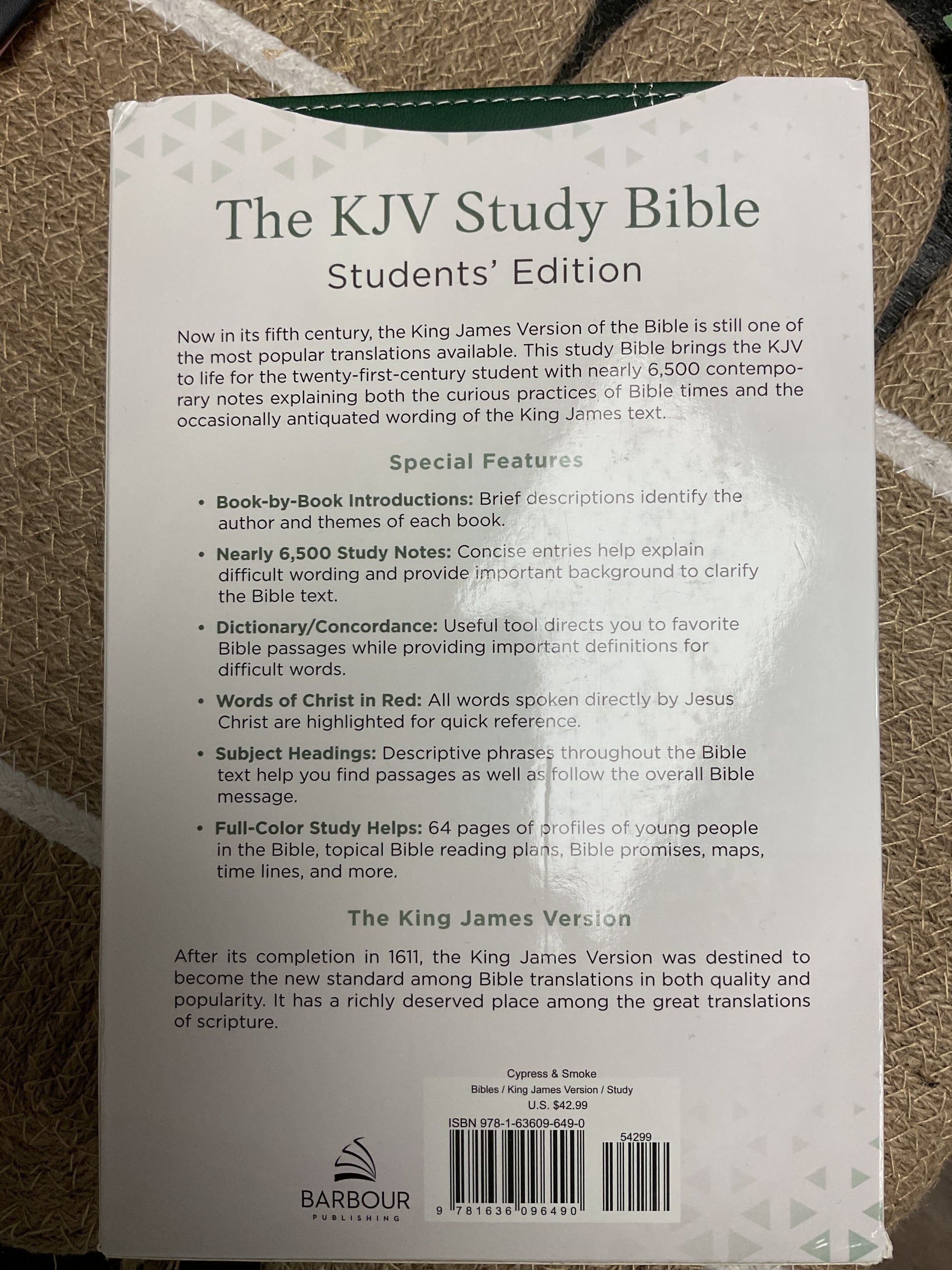 The KJV Study Bible, Student Edition includes many additional features on top of all the study helps you love: 6,500 contemporary study notes, individual book introductions, the words of Christ in red, a dictionary/concordance, and 8 pages of maps. Also includes 56 full-color inserts with student-oriented study and devotional content: