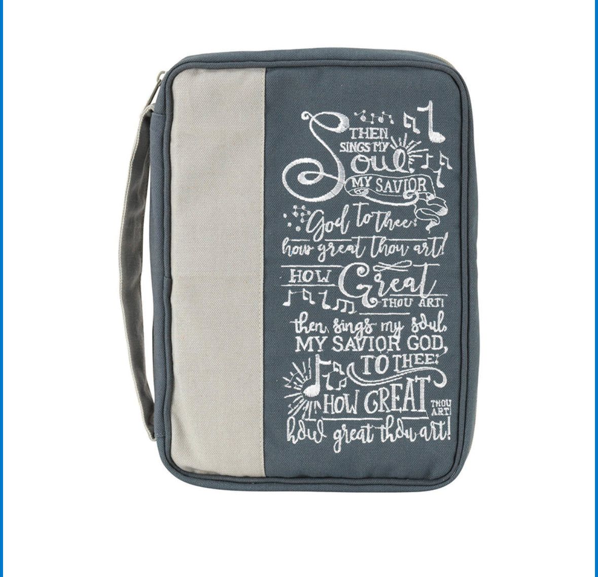 Fabric Bible cover made of a jute and cotton blend is embroidered with the words from the beloved hymn "How Great Thou Art" by Stuart K. Hine; Then sings my soul, my Saviour God, to Thee: How great Thou art! how great Thou art!.