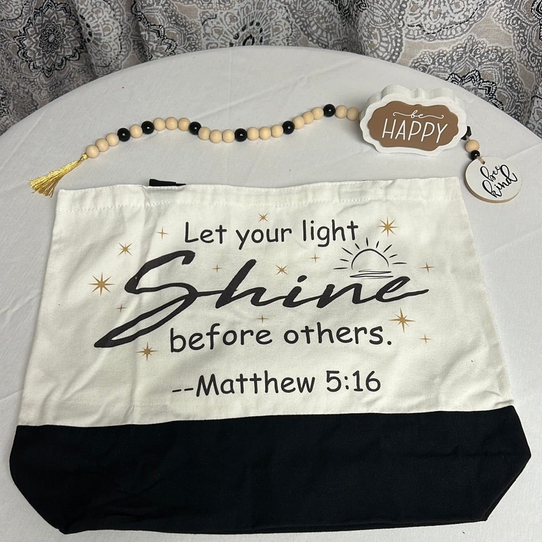 Expertly crafted in a unique two-tone design, this tote bag features a subtle combination of tan and black, perfectly complemented by the powerful words of Matthew 5:16. With a spacious 14 inch wide and 14 inch deep interior, this tote is both stylish and functional for all your daily essentials.