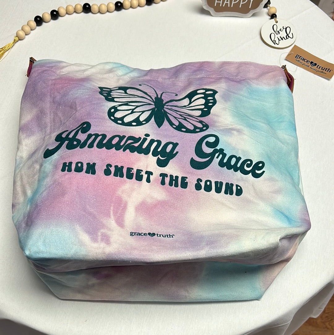 This Butterfly Amazing Grace tote bag is a stunning addition to your collection. The beautiful blue and purple design, along with its generous 14 inch by 14 inch size, makes it the perfect accessory for any occasion. Carry your belongings in style and make a statement with this eye-catching tote bag.